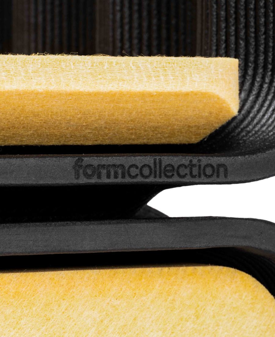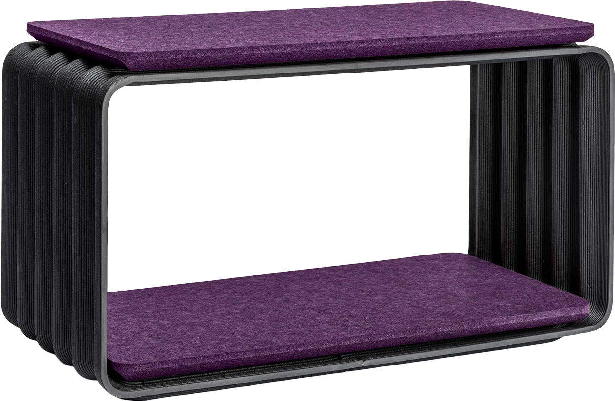 WAVE: frame ist Regal, Raumtrenner und Statement zugleich. Der markante Wellenkörper wird aus recyceltem Karbon gefertigt und mit einem farbigen Filzinlay ergänzt. Das Modul ist stapelbar und passt sich unterschiedlichsten Nutzungsszenarien an – vom Wohnbereich bis zum Office. Als Einzelstück funktioniert es ebenso wie im System.