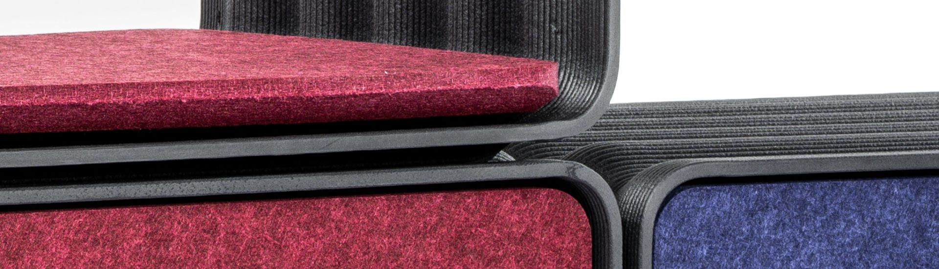 Gefertigt aus recycelten Karbonfasern aus der Automobilindustrie und alten Windrädern, kombiniert mit Filz aus recyceltem PET-G.